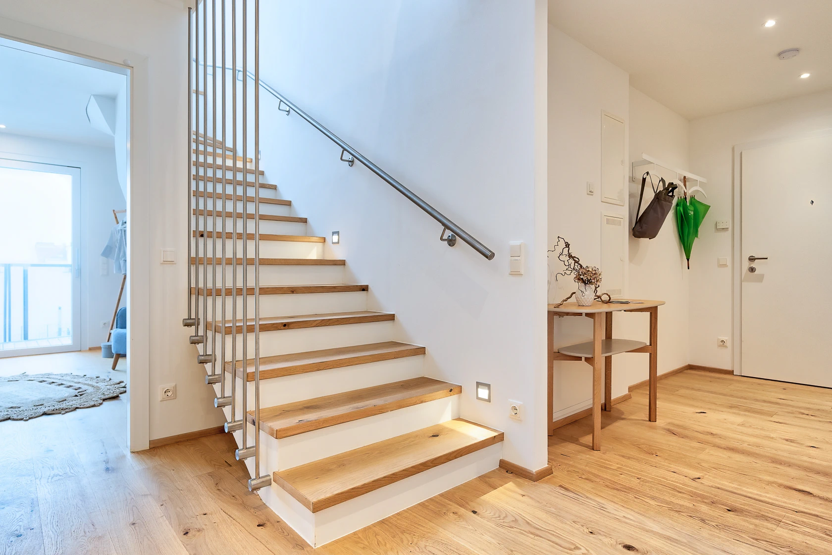 Naše stopnice z LED svetlobnimi trakovi so pravi poudarek, ki osvetli vaše stopnišče in zvečer poudari edinstveno strukturo parketnih površin. Vrez za LED svetlobni trak, vključno z aluminijastim vodilom in mat steklenim pokrovom, je na voljo po naročilu in je izvedljiv izključno pri stopnicah z U-profilom.